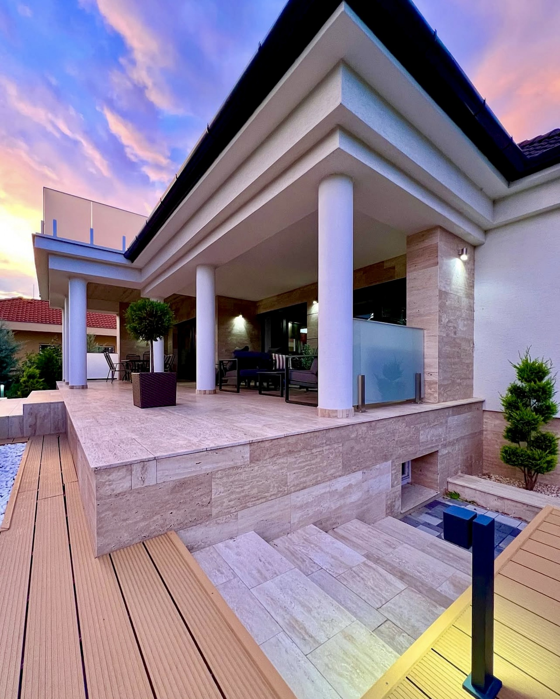A villa bruttó 550 m2 3 szinten, hatalmas fedett illetve napozó teraszokkal, prémium jakuzzival, kinti pihenő lounge illetve étkező szekcióval. 150 m2 térburkolat, kültéri parkolók 6 autó számára ( 2 külső parkoló a ház előtt, 4 pedig belül ) + teremgarázs!