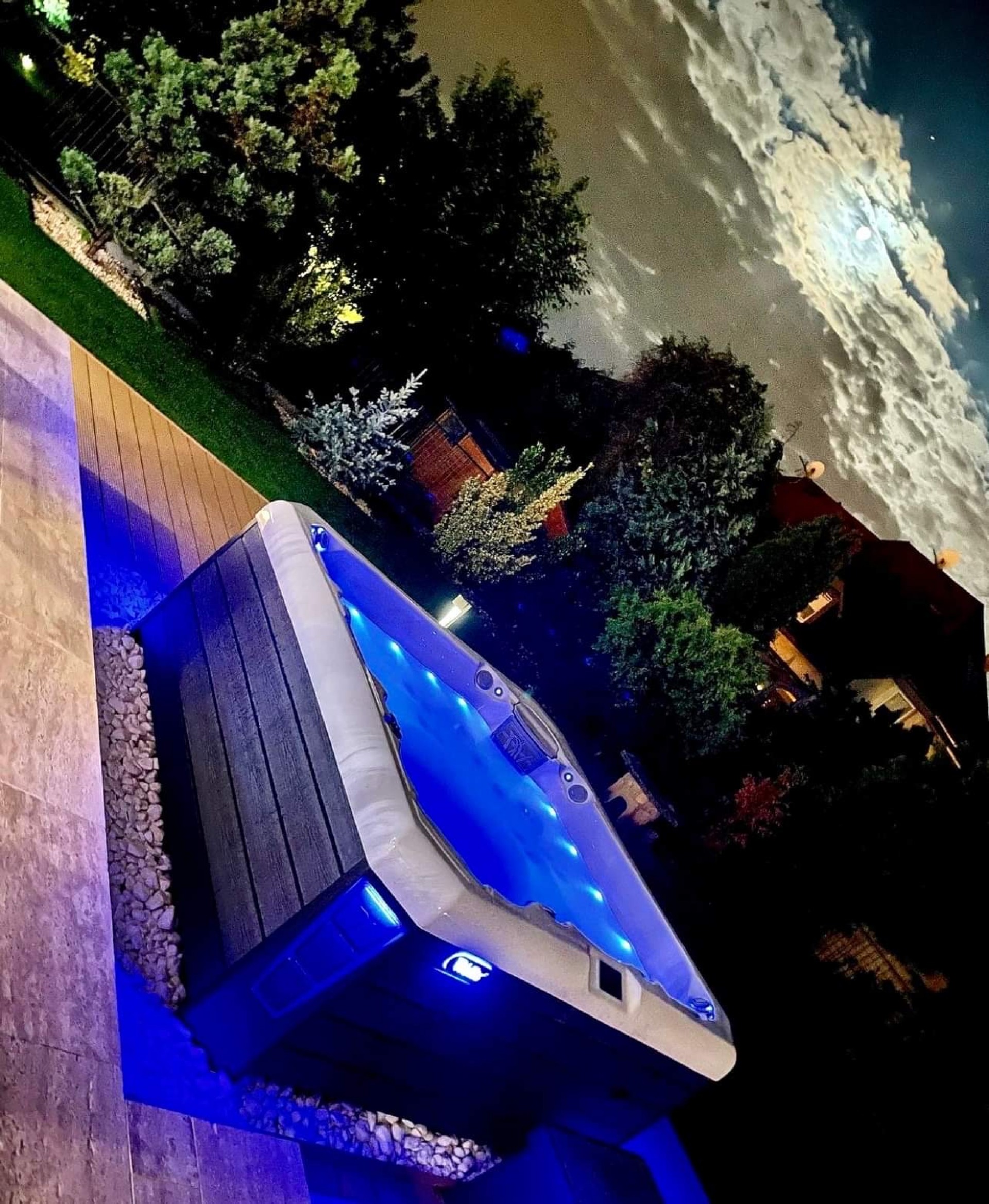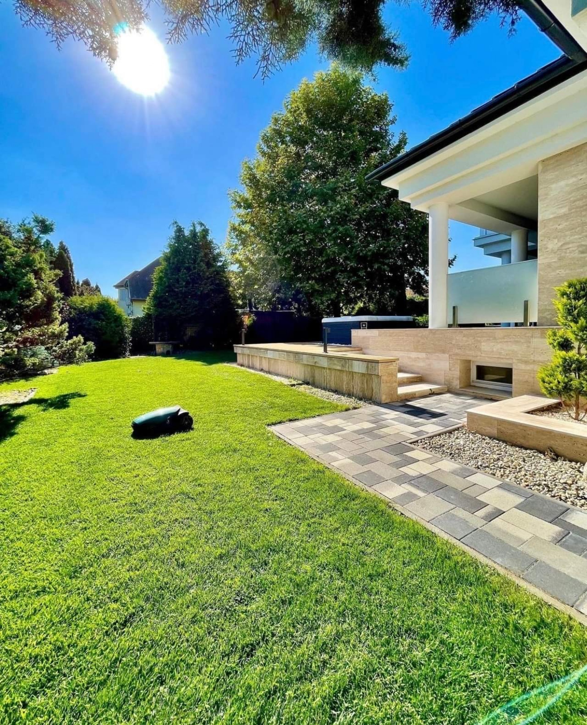 A gyönyörűen parkosított kertben 50 méteres fúrt kútból biztosított a tökéletes öntözés, ennek köszönhetően a vízdíj is minimális, továbbá az okos öntöző rendszerrel összehangolt telepített robot fűnyíró gondoskodik a teljes kényelemről és az állandóan frissen nyírt zöld pázsitról. A kert igazi ékessége egy 25 éves csodálatos Platán fa, amely a nyári forróságban fantasztikus mikroklimát teremt.