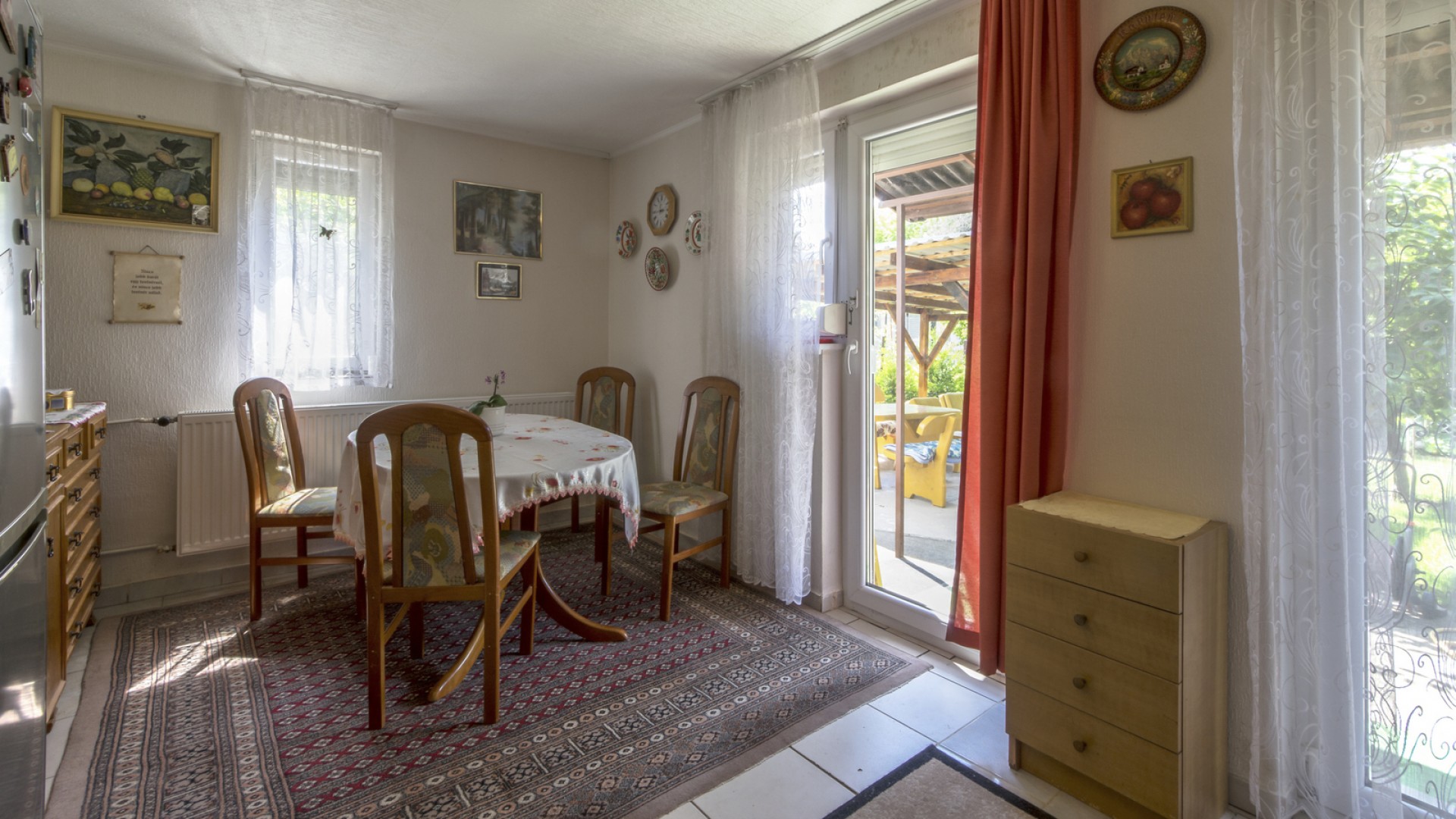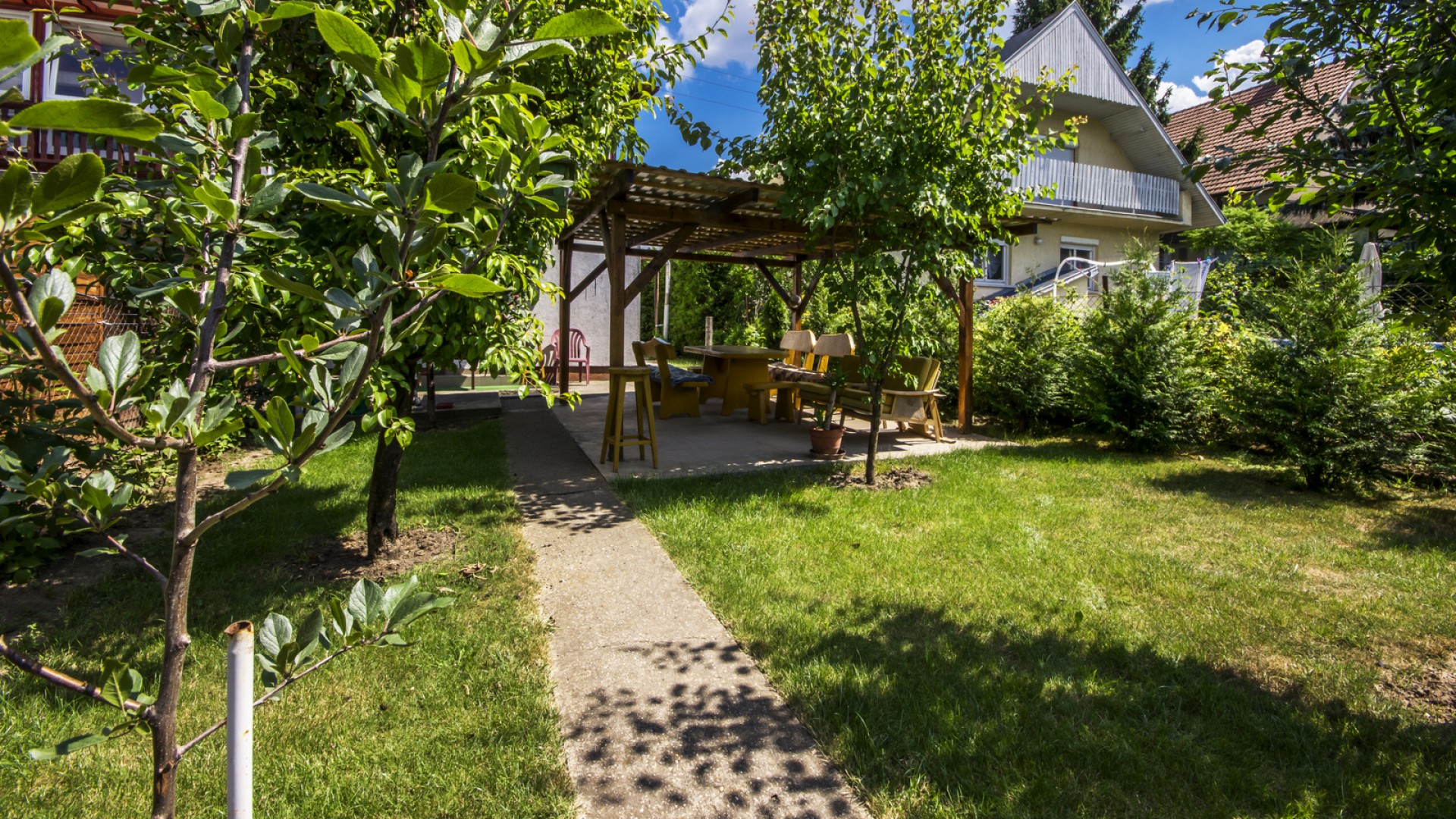 A 80 as években épült ikerház nagy előnye a sok szoba és a gyönyörű, de nem túl nagy kert.