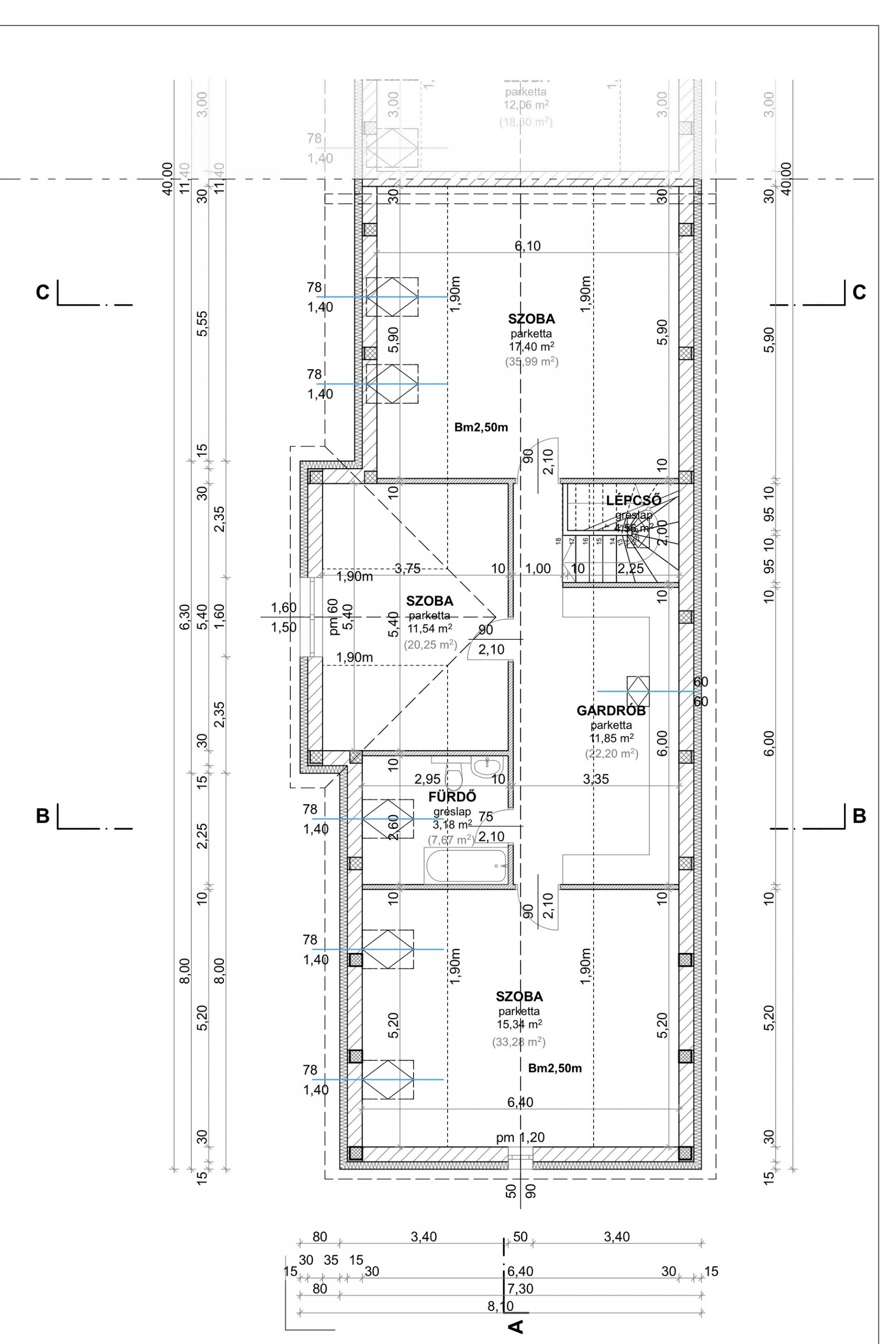 Tetőtérben helyezkedik el: Szoba 17,40m2, Szoba 11,54m2, Szoba 15,34m2,