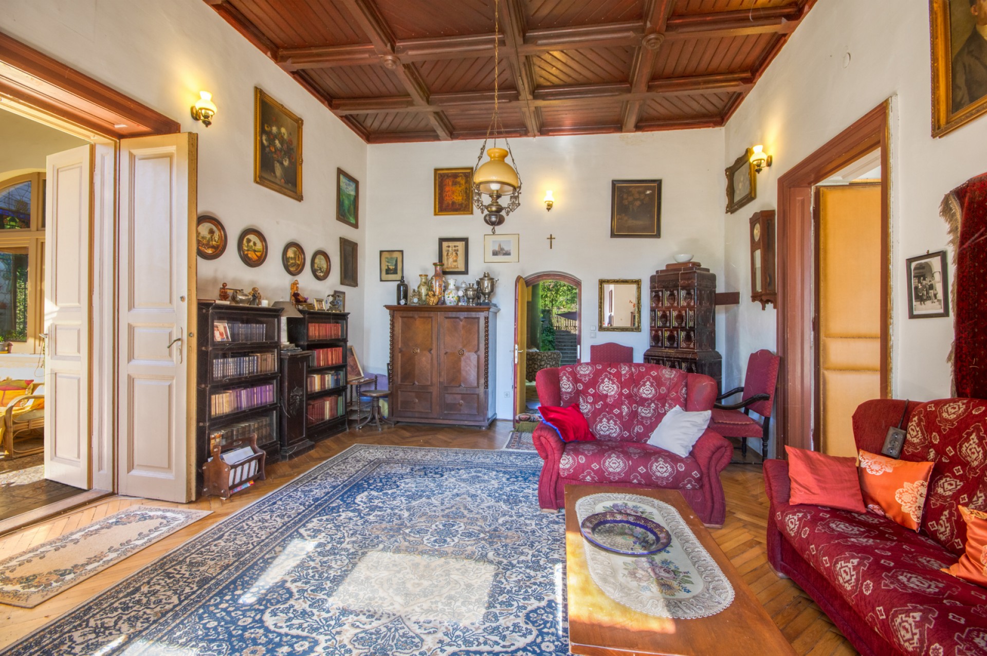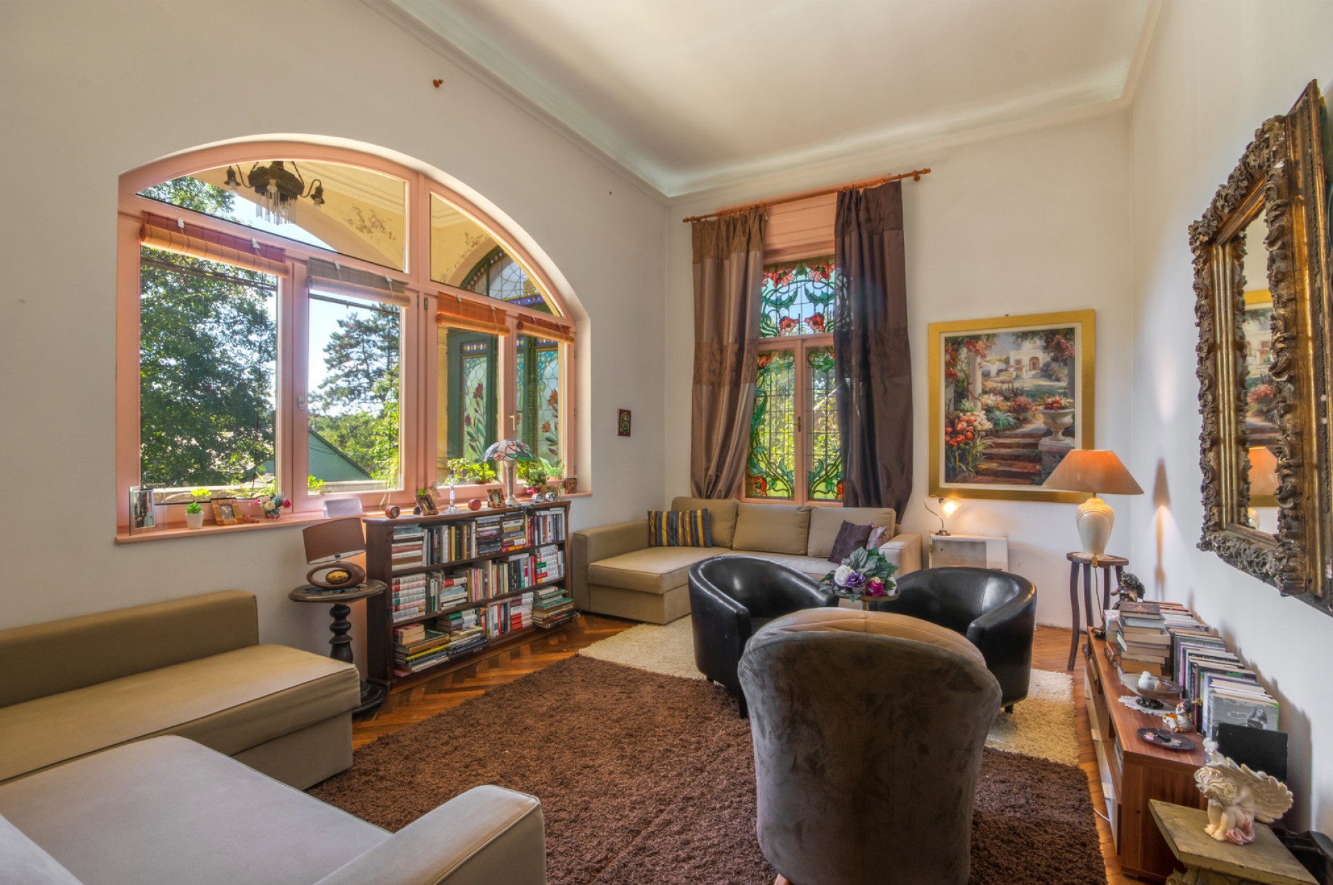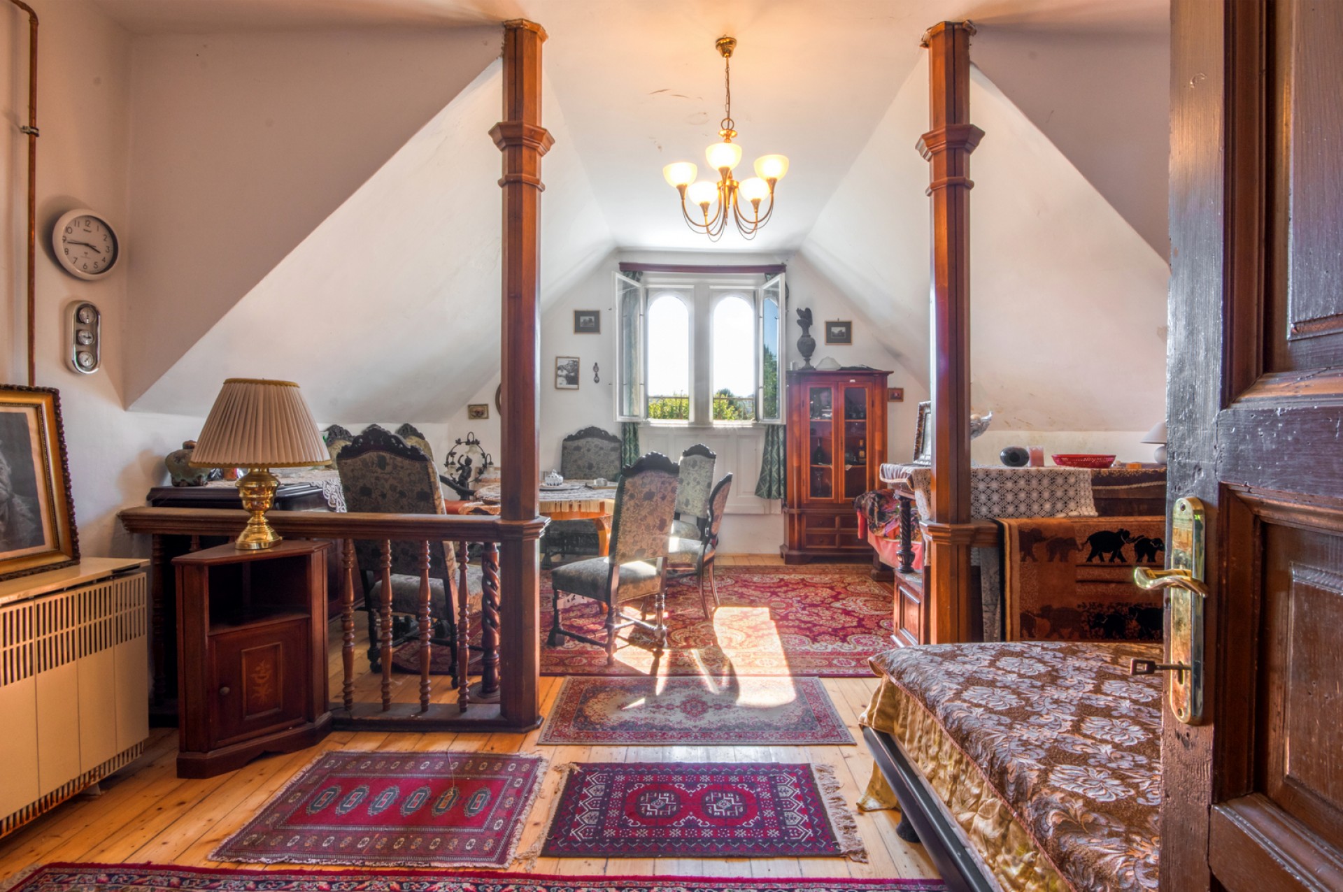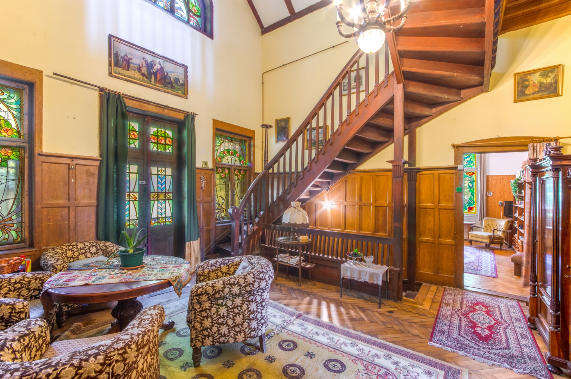 Impozáns szalon, klasszikus fogadótér, korhű nagy belmagasságú manzárd