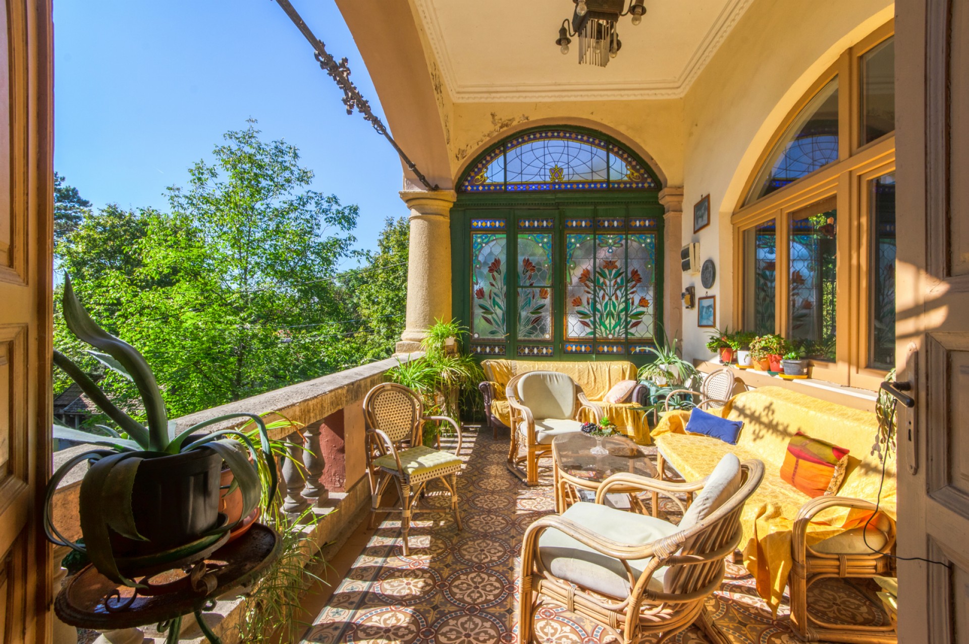 Hangulatos, három oldalról zárt terasz, üvegablakokkal díszítve