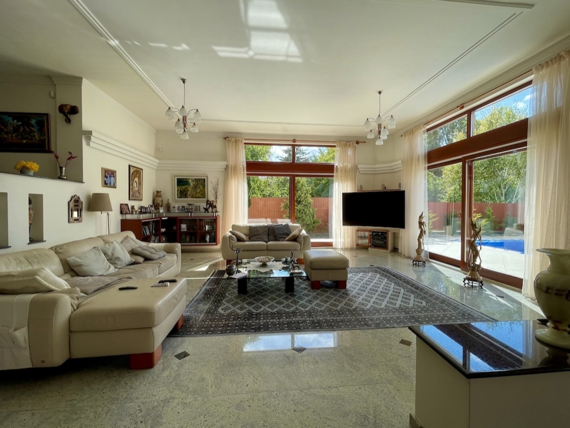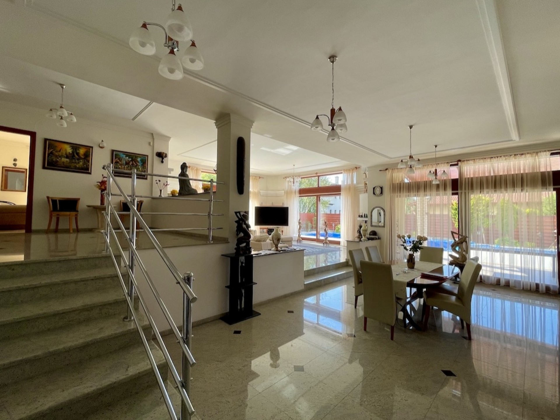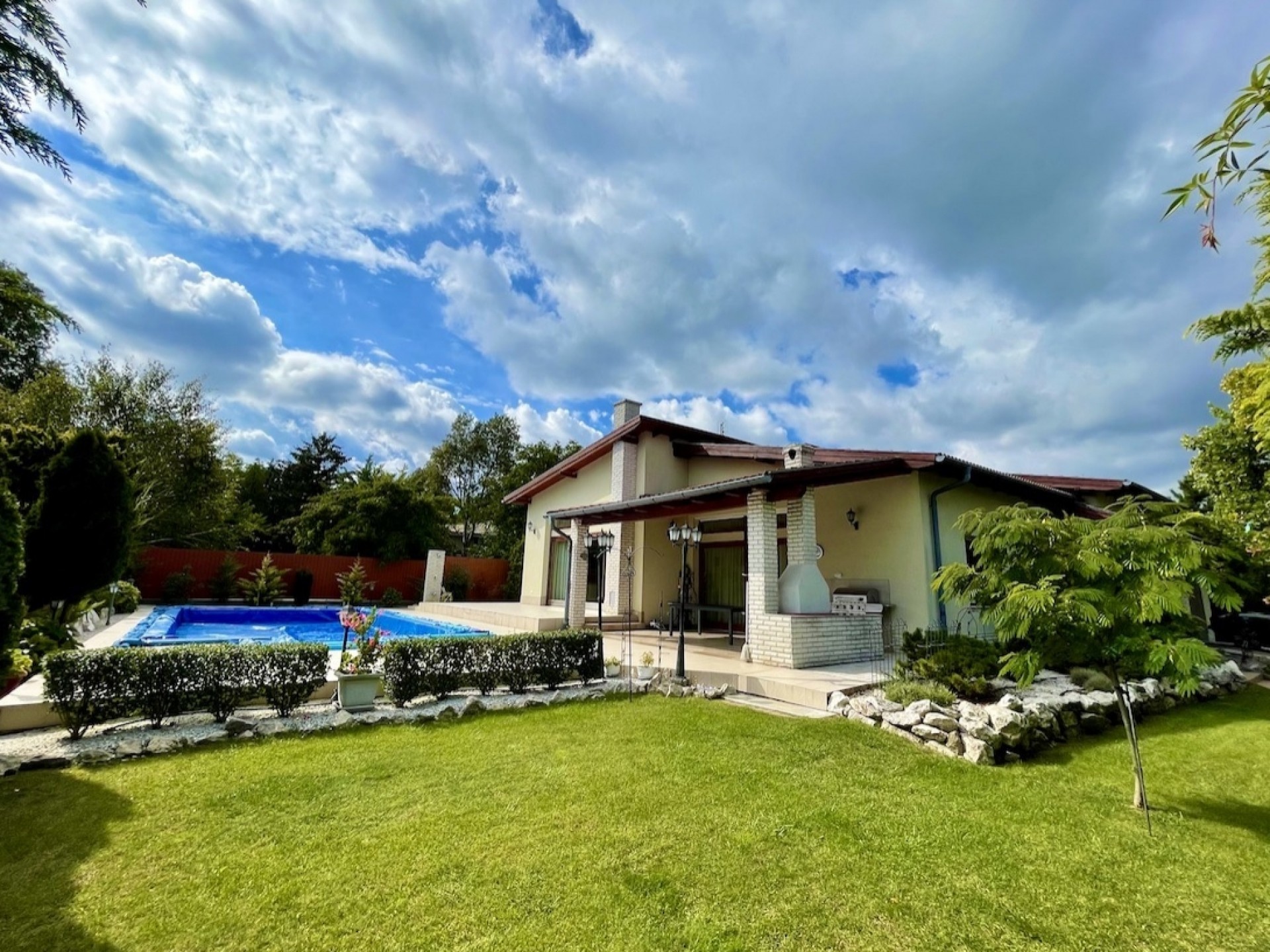 Igazi napfényben úszó, egyszinten elterülő, kényelmes luxus otthon, medencére néző hatalmas üvegfelületekkel, tágas kerti nyárikonyhával és számtalan extrával.
