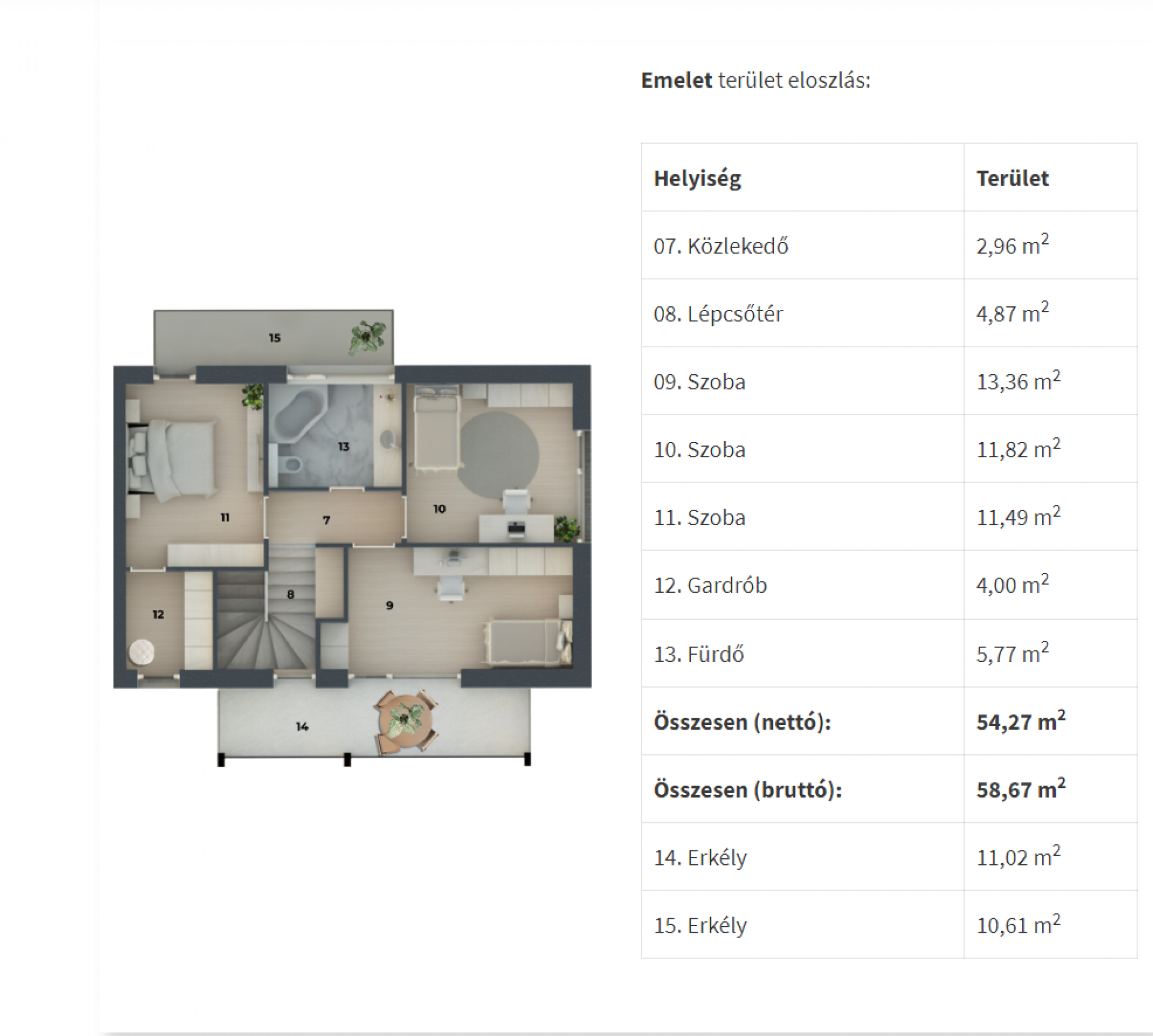 A földszint és az emelet hasznos alapterülete 107 m2.