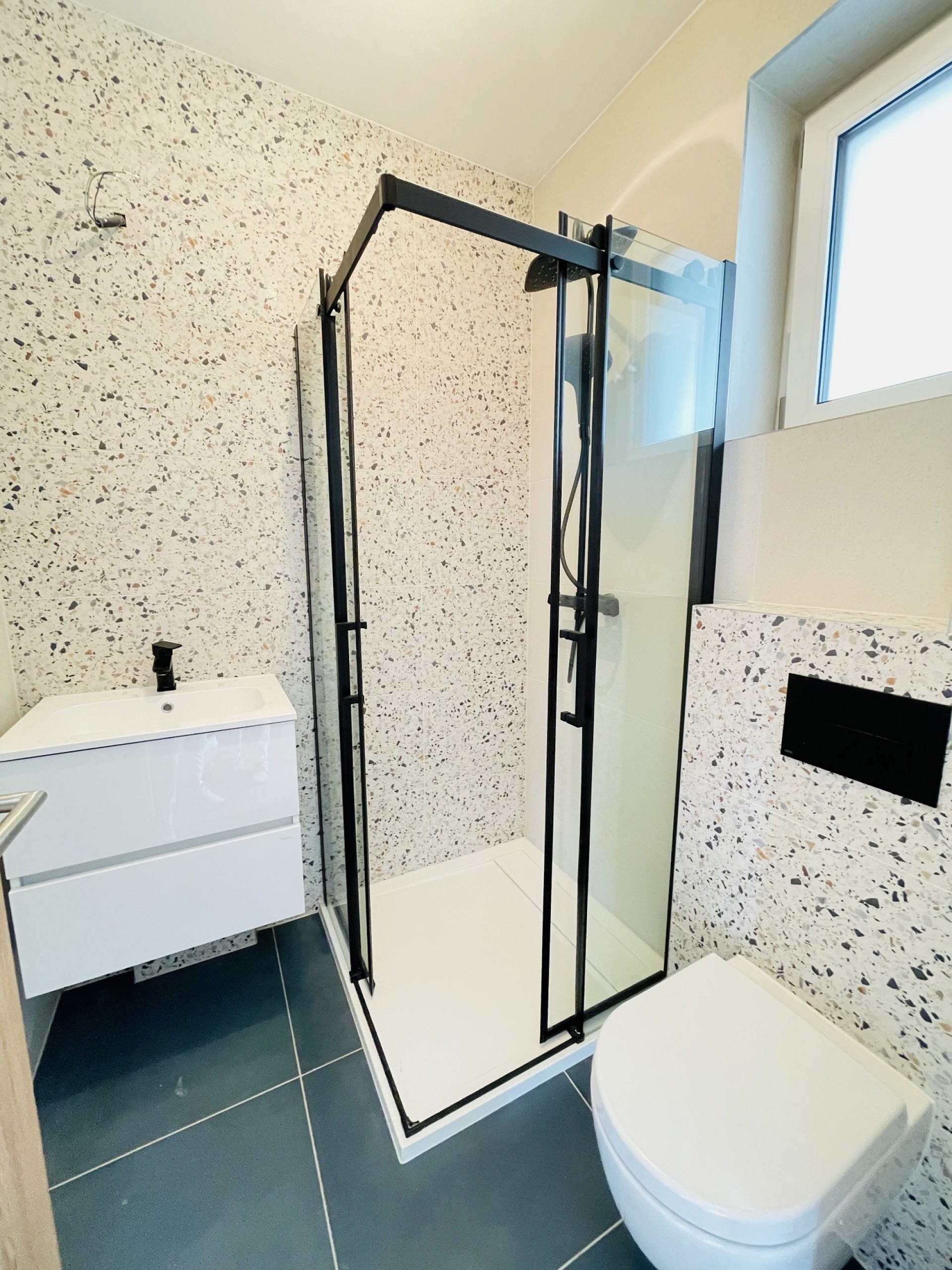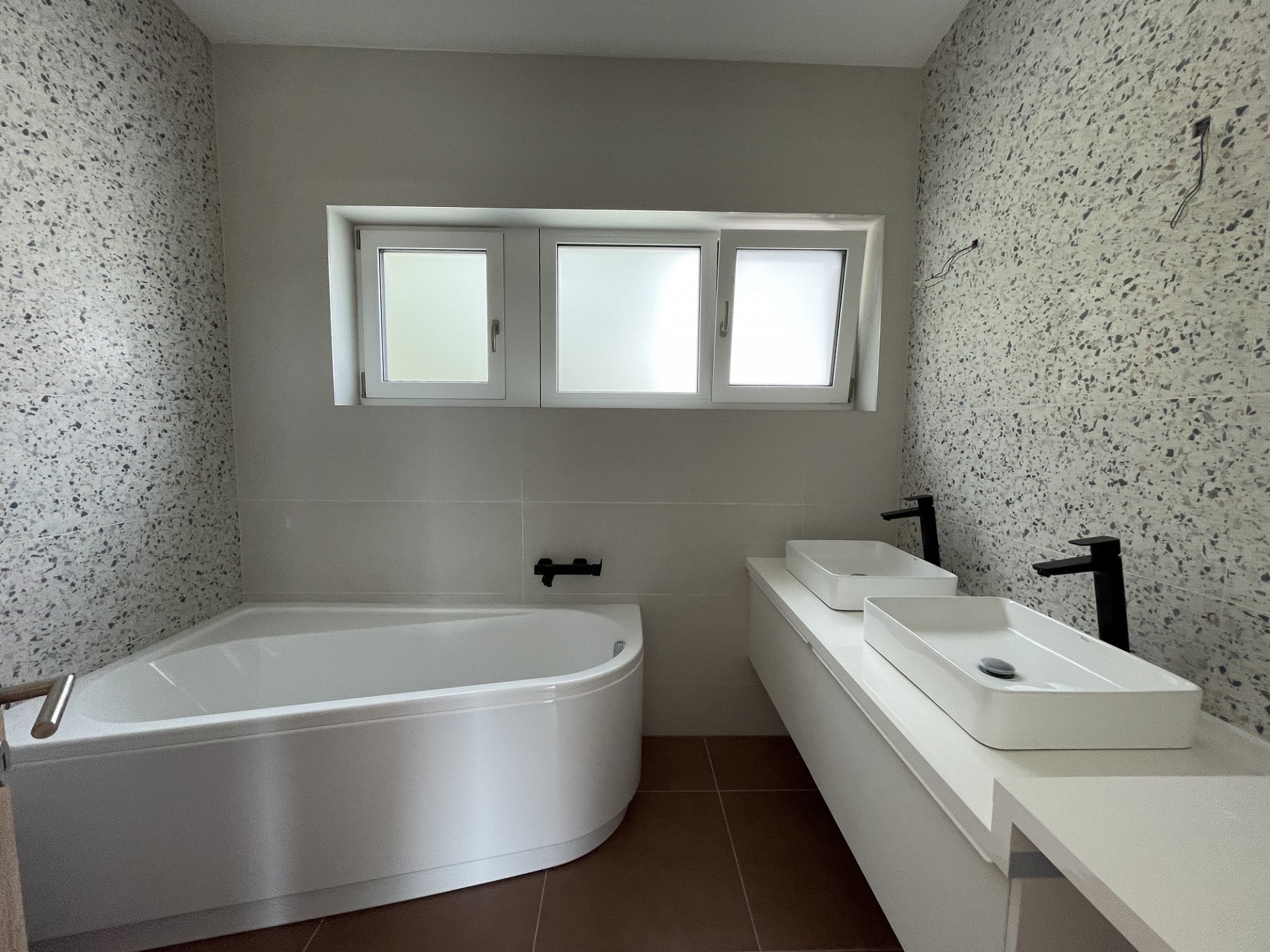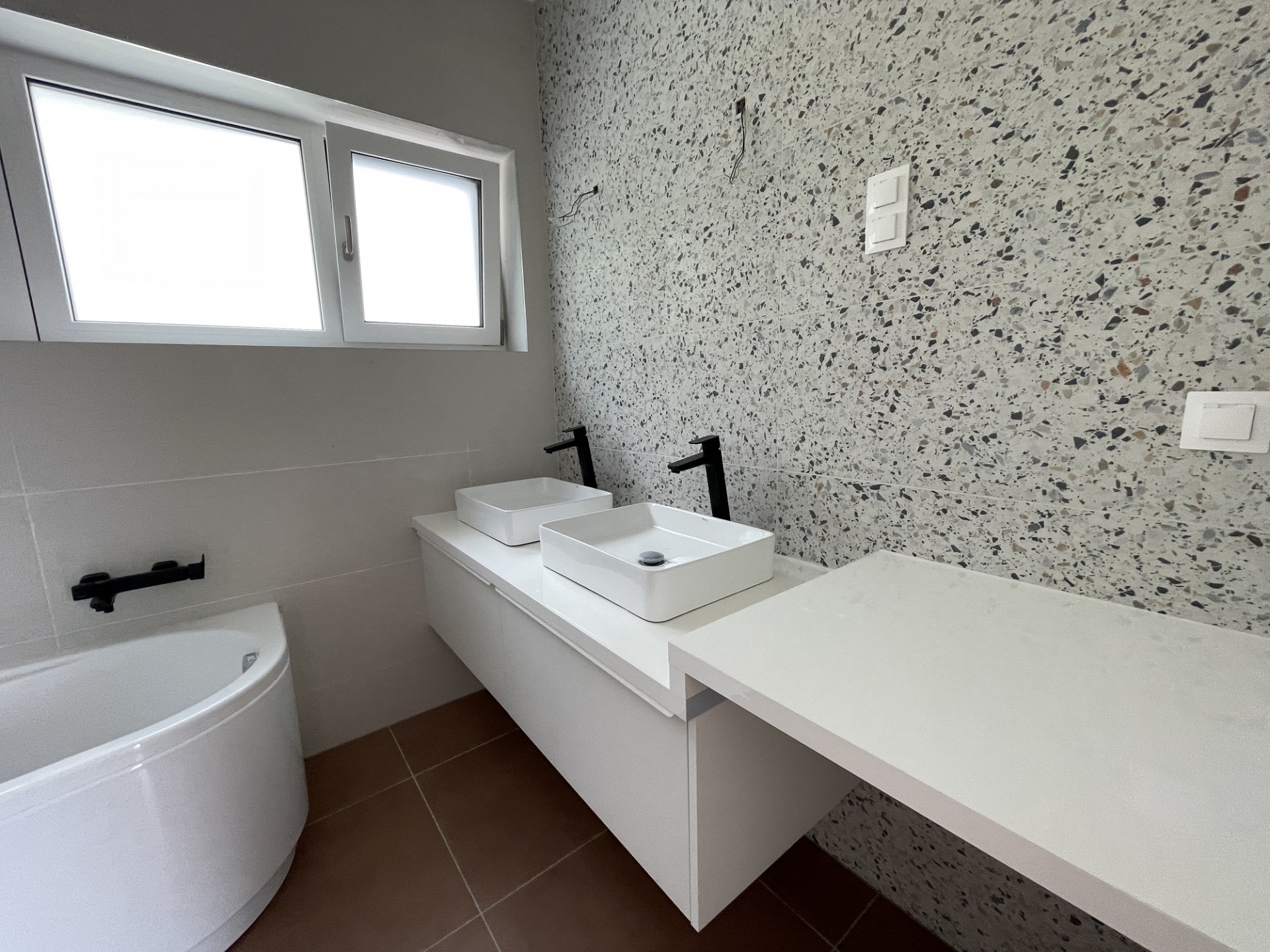 A közlekedő és vizes helységekben csúszásálló greslap és csempe. A belső falak 2x glettelve, csiszolva és tört fehér színre festve vannak.