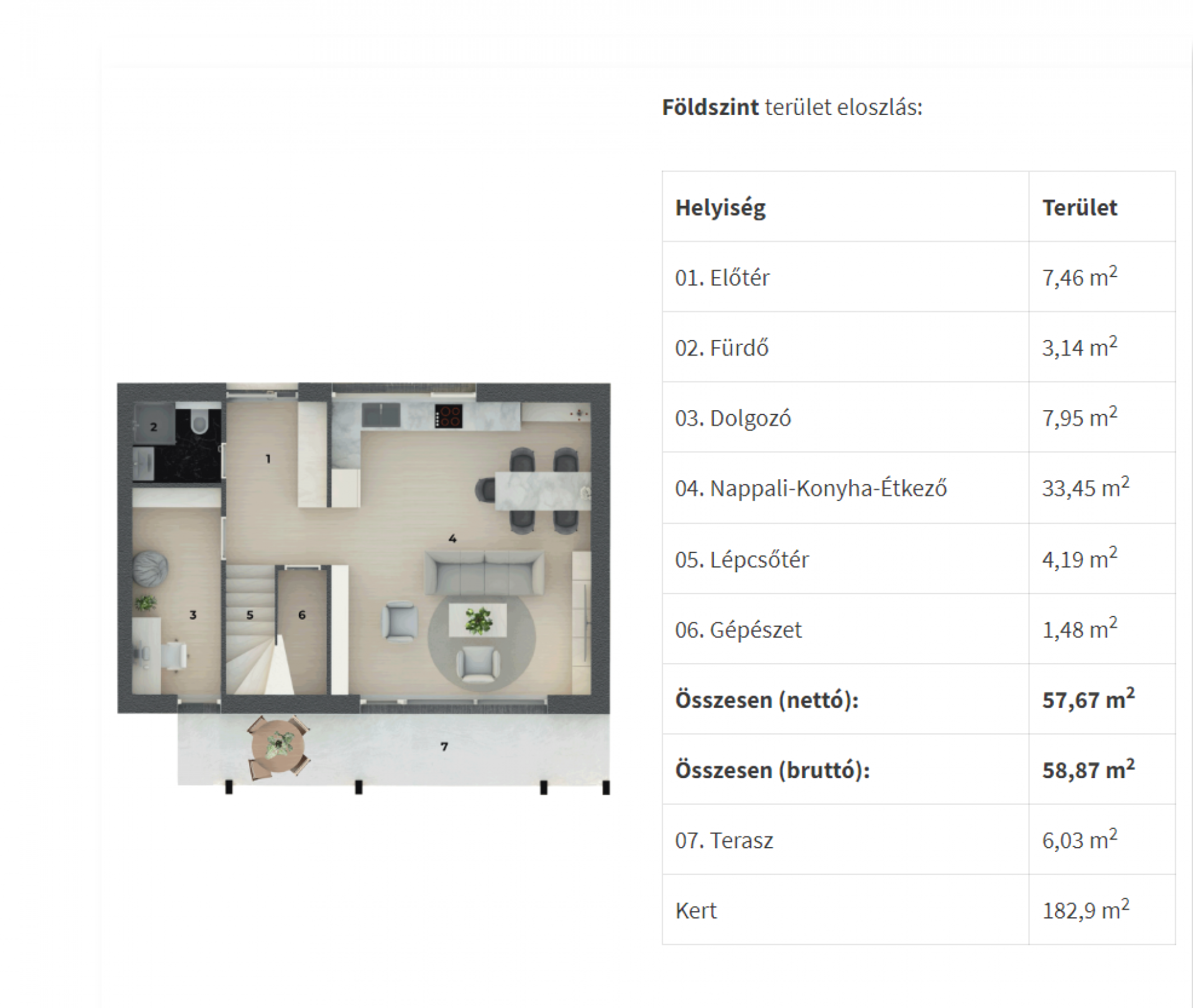 A földszint és az emelet hasznos alapterülete 114,93 m2.